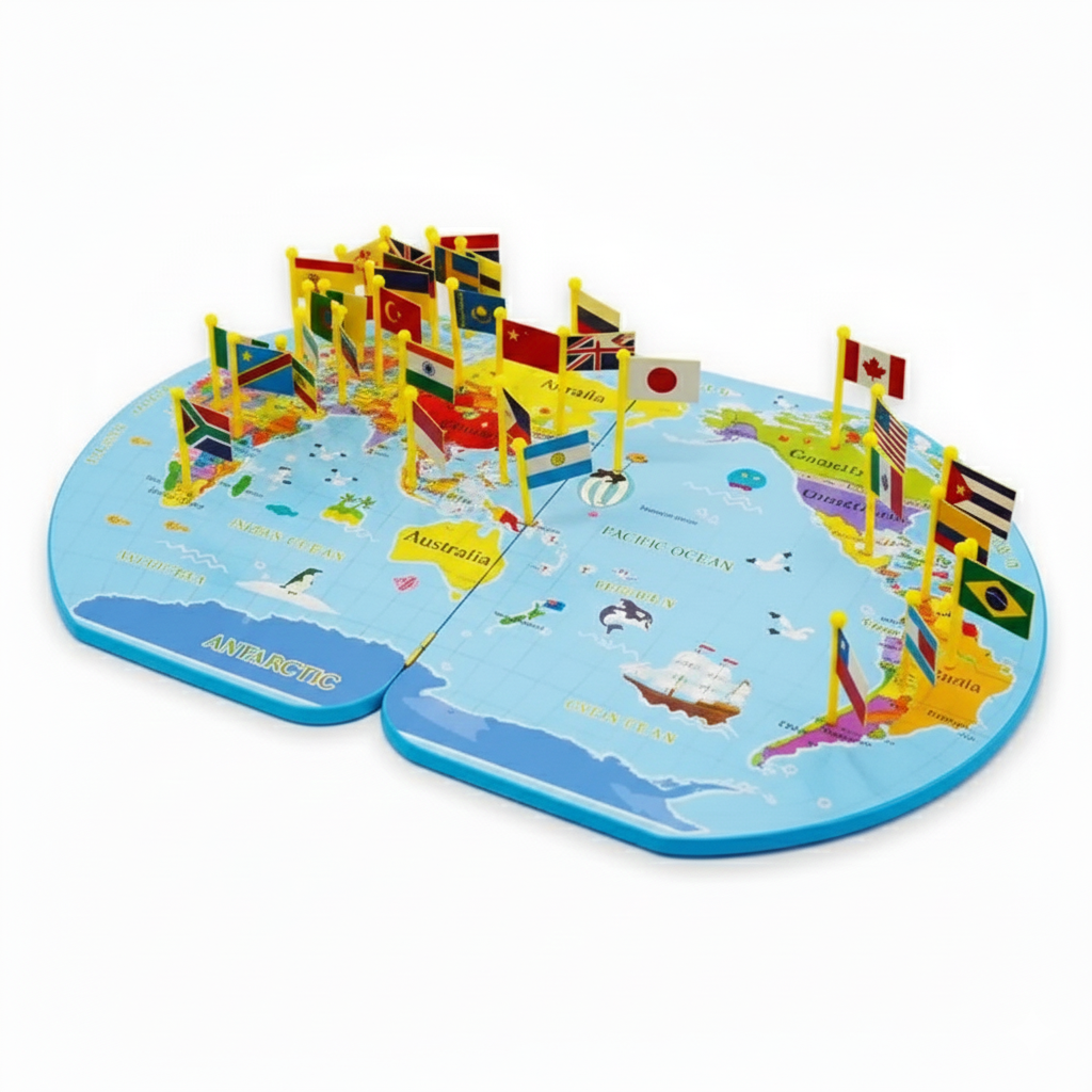 Dezvoltă logica și orientarea în spațiu, copiii trebuind să potrivească steagurile cu locațiile corespunzătoare de pe hartă.