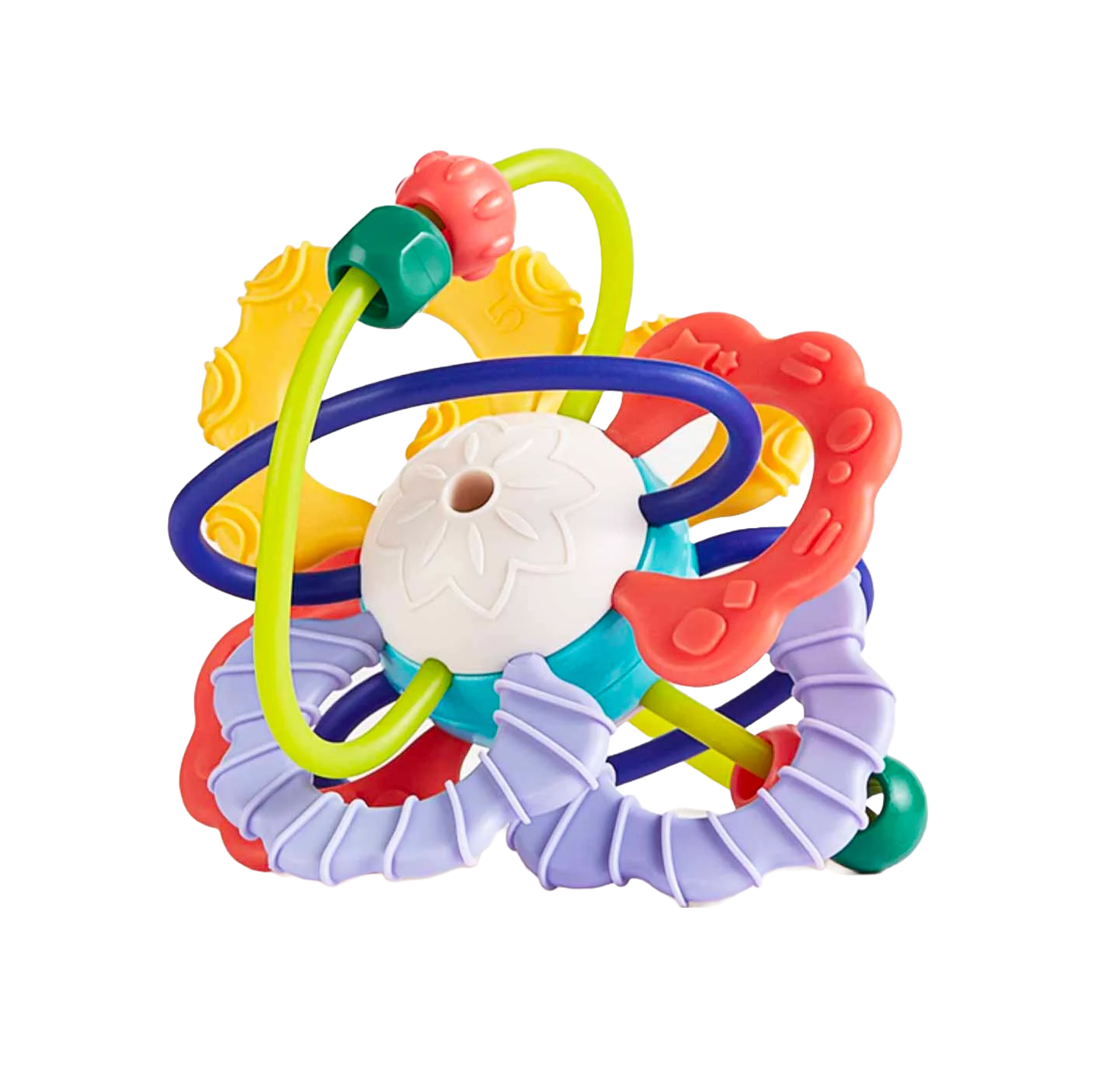 O jucărie de dentiție complexă care o sa il captiveze pe copil prin multitudinea de texturi si activități pe care le poate realiza cu ea: o poate rostogolii, ronțăi sau se poate juca cu bilele de pe inele.