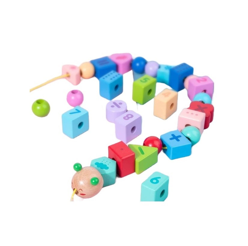 Provoacă copilul să aibă răbdare și să folosească ambele mâini pentru a reuși să inșiruie piesele pe sfoară. În timpul procesului va inspecta și va aprofunda noțiuni despre forme, culori și cifre.