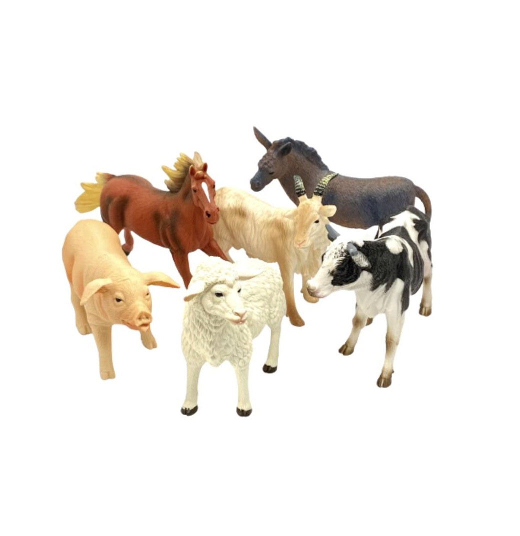 Setul contine 6 animale de la ferma fabricate din cauciuc: cal, vaca, oaie, capra, magar si porcusor.